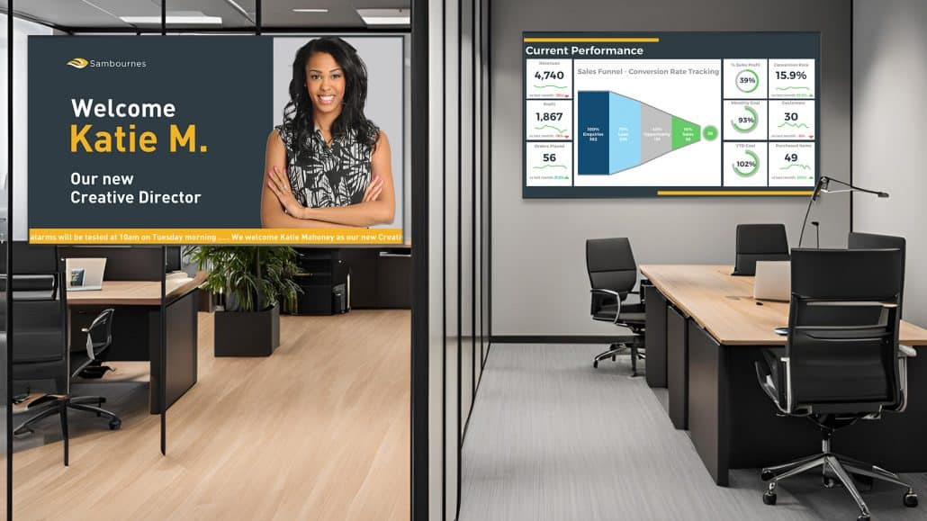 Why not also use your digital signage to feature business tracking tools and workflows on-screen? It’s a powerful way to keep teams motivated and on-track, enabling them to monitor their progress at a glance.